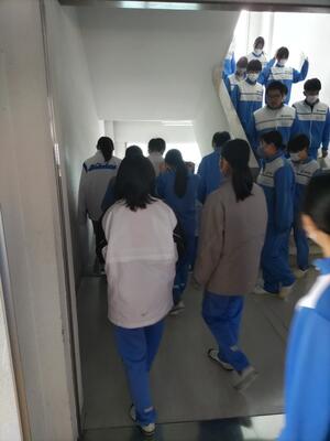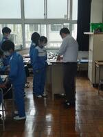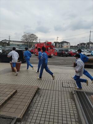 地震後に出火との想定で、避難訓練を行ないました。皆整然と避難しました。消防署の方から講話をいただき、消火器を使って消火訓練も行いました。