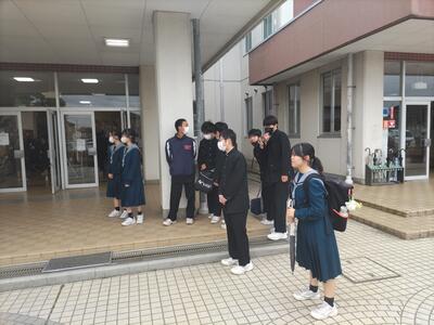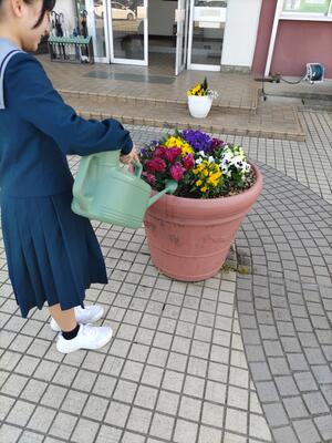 2学年委員の皆さんが、登校時の昇降口で爽やかにあいさつを交わしています。美化委員の活動により花々も元気です。