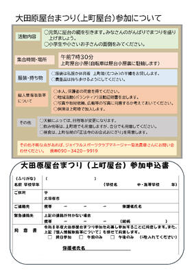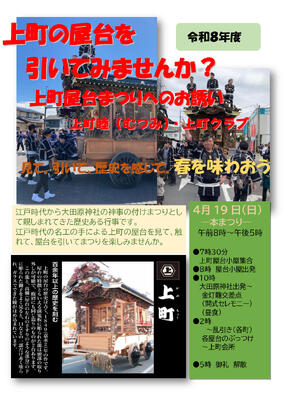 令和8年4月19日(日)に開催される「大田原屋台まつり」の上町屋台参加についての要項です。tetoruで送付するGoogleフォームを利用して申し込んでください。なお、2・3年生は4月7日に、1年生は4月9日に送信予定です。